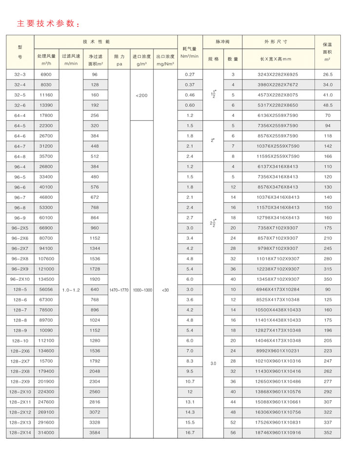 結構特點 采用分室、箱式結構、脈沖閥用量少、壽命長,采用進口脈沖閥動作可達100萬次以上,并實現了不停機檢修。 外濾式,采用大口徑脈沖閥,高壓、小氣量脈沖清灰清灰強度高,需壓縮空氣(0.5一0.7Mpa)。 分室隔離清灰一離線清灰,清灰徹底、效果好,減少二次揚塵,阻力小、能耗低,濾袋平均壽命可達兩年以上。 換袋及檢修在頂部進行、干凈、方便、快捷。 程序控制器采用單片機或PLC控制,具有運行穩定可靠,抗干擾性強等特點。PLC控制器可根據用戶要求配置,設計成具有與其它可分編程控制器以上位機聯網功能。 系列化設計,多種規格可滿足不同現場情況的處理需要。 設備總體結構緊湊合理,占地面積小。